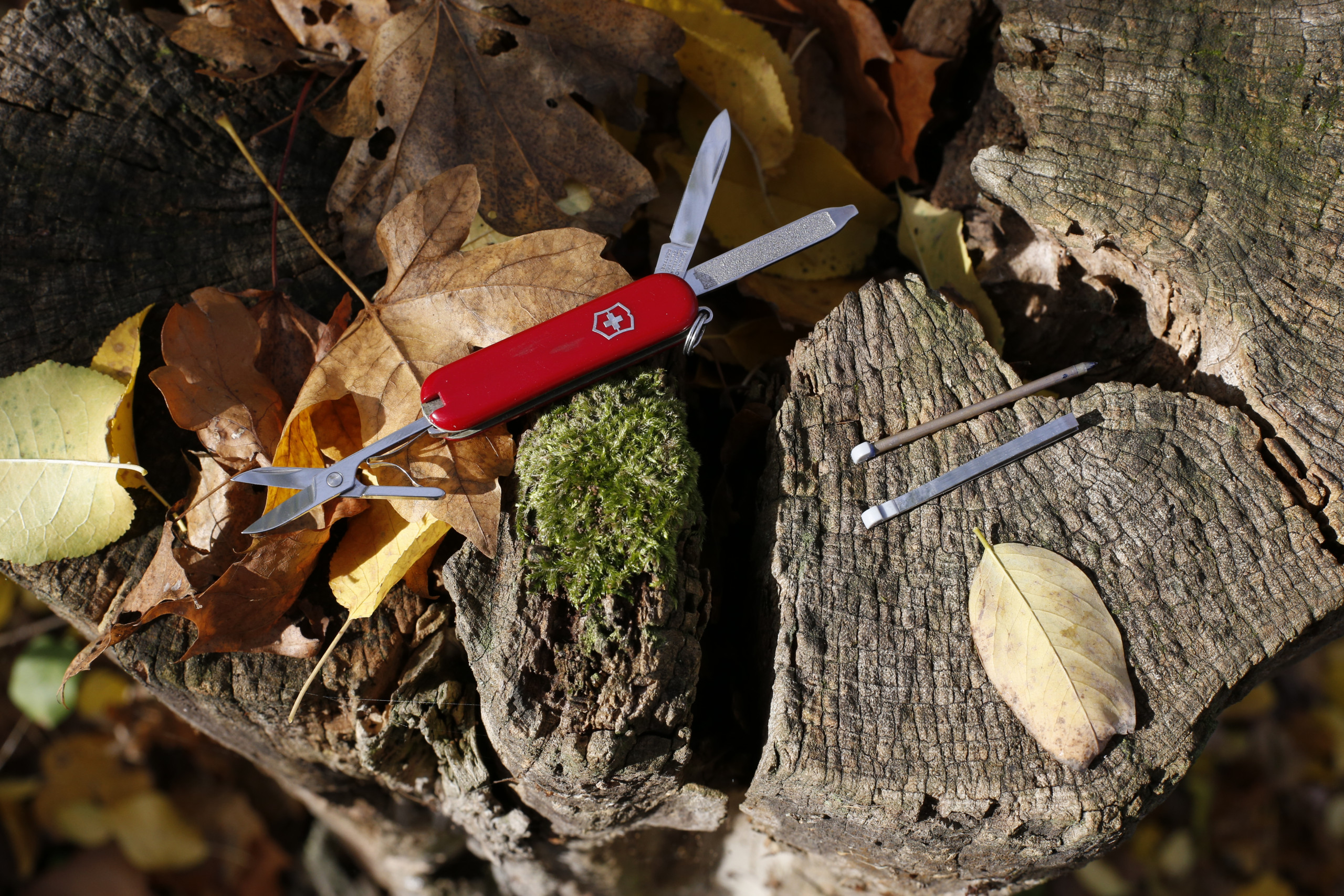 Rückblickend kann ich nur dankbar sein, dass dieses unvorhergesehenen Erlebnis meine kleine Bastelanleitung etwas aufwertet. Die beschränkt sich nämlich auf die Feststellung, dass sich 58 Millimeter kleine Taschenmesser von Victorinox – ebenso wie die 91 Millimeter großen Modelle – durch einen Tausch der Griffschalen um einen Kugelschreiber erweitern lassen.